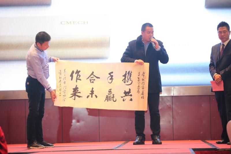 連云港市門窗協(xié)會會長潘國柱向本屆交流會的主辦方敬獻一幅書法作品,并發(fā)表“攜手合作,共贏未來”的主題演講。