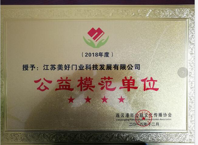 江蘇美好門業(yè)科技發(fā)展有限公司榮獲“公益模范單位”榮譽稱號。